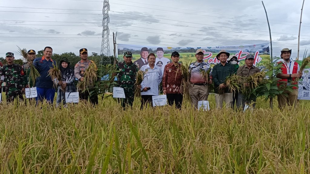 Kades Namang, Bupati dan Forkopimda Bangka Tengah Bersama Stakeholder Terkait Saat Melakukan Panen Raya Padi Merah Organik. BANGKA TENGAH, Berliannews.id
