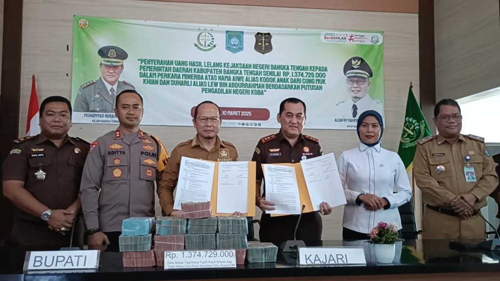 Bupati Algafry Saat Menunjukan Surat Serah Terima Dana Hasil Lelang Sebesar Rp1,3 M Bersama Kajari Bangka Tengah, Kapolres Bangka Tengah
