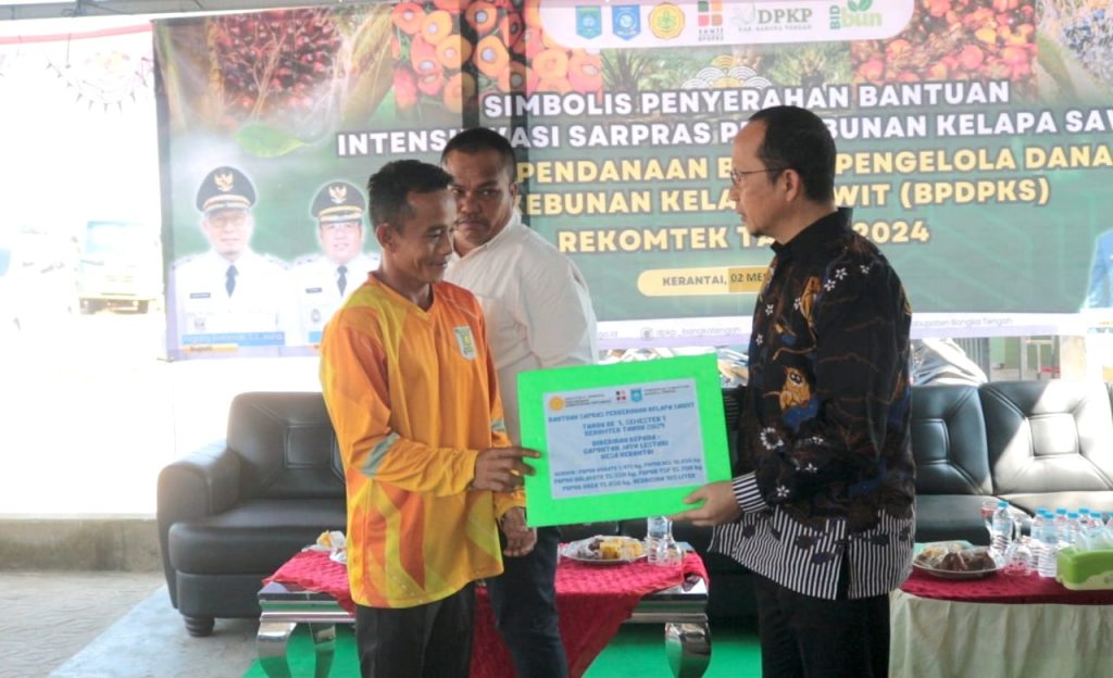 BANGKA TENGAH, Berliannews.id – Bupati Bangka Tengah, Algafry Rahman menyerahkan bantuan kegiatan intensifikasi sarpras perkebunan kelapa sawit senilai Rp1.526.572.400