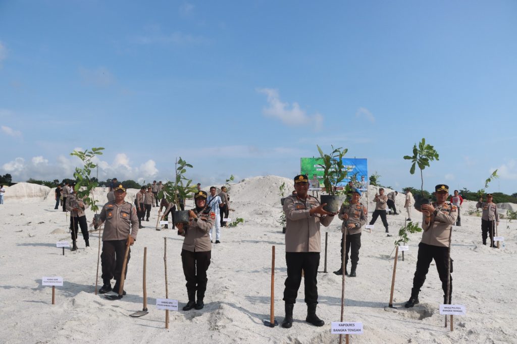 Kapolres Bersama Personil Polres Bangka Tengah Saat Melakukan Penanaman Pohon bersama. BANGKA TENGAH, Berliannews.id – Dalam upaya mendukung pelestarian lingkungan