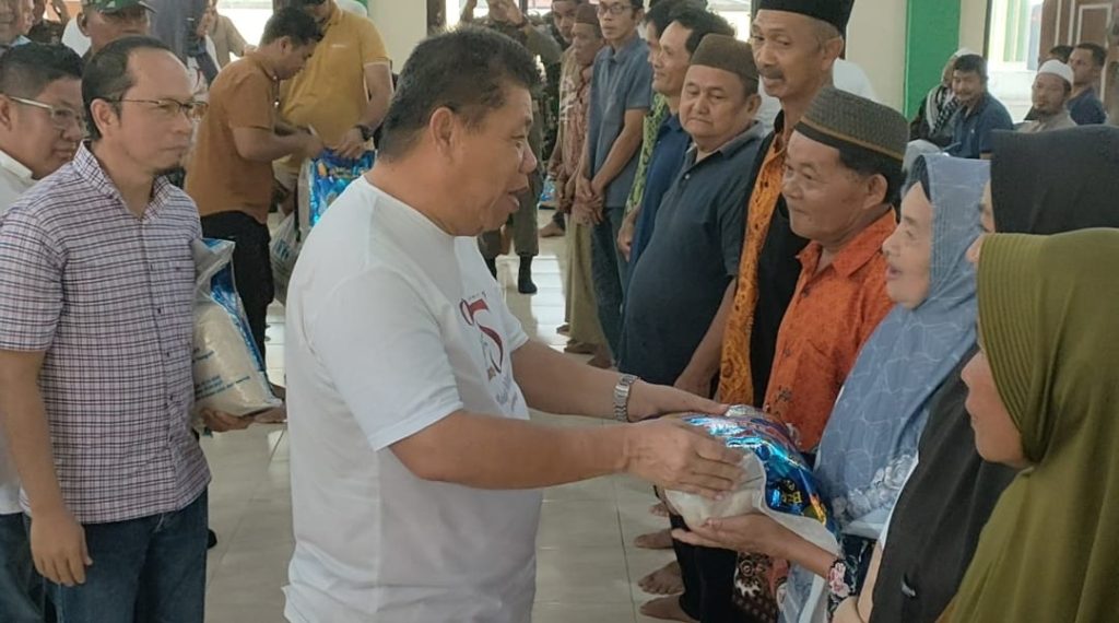 Gubernur Babel, Hidayat Arsani Saat Menyerahkan Langsung Beras Kepada Masyarakat Desa Kulur Ilir. BANGKA TENGAH, Berliannews.id – Sebanyak ribuan paket