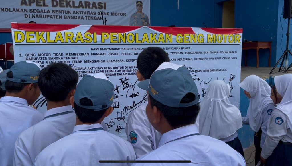 Para pelajar Bangka Tengah saat menandatangani deklarasi menolak gank motor di Bangka Tengah. Foto : berliannews.id BANGKA TENGAH, Berliannews.id –
